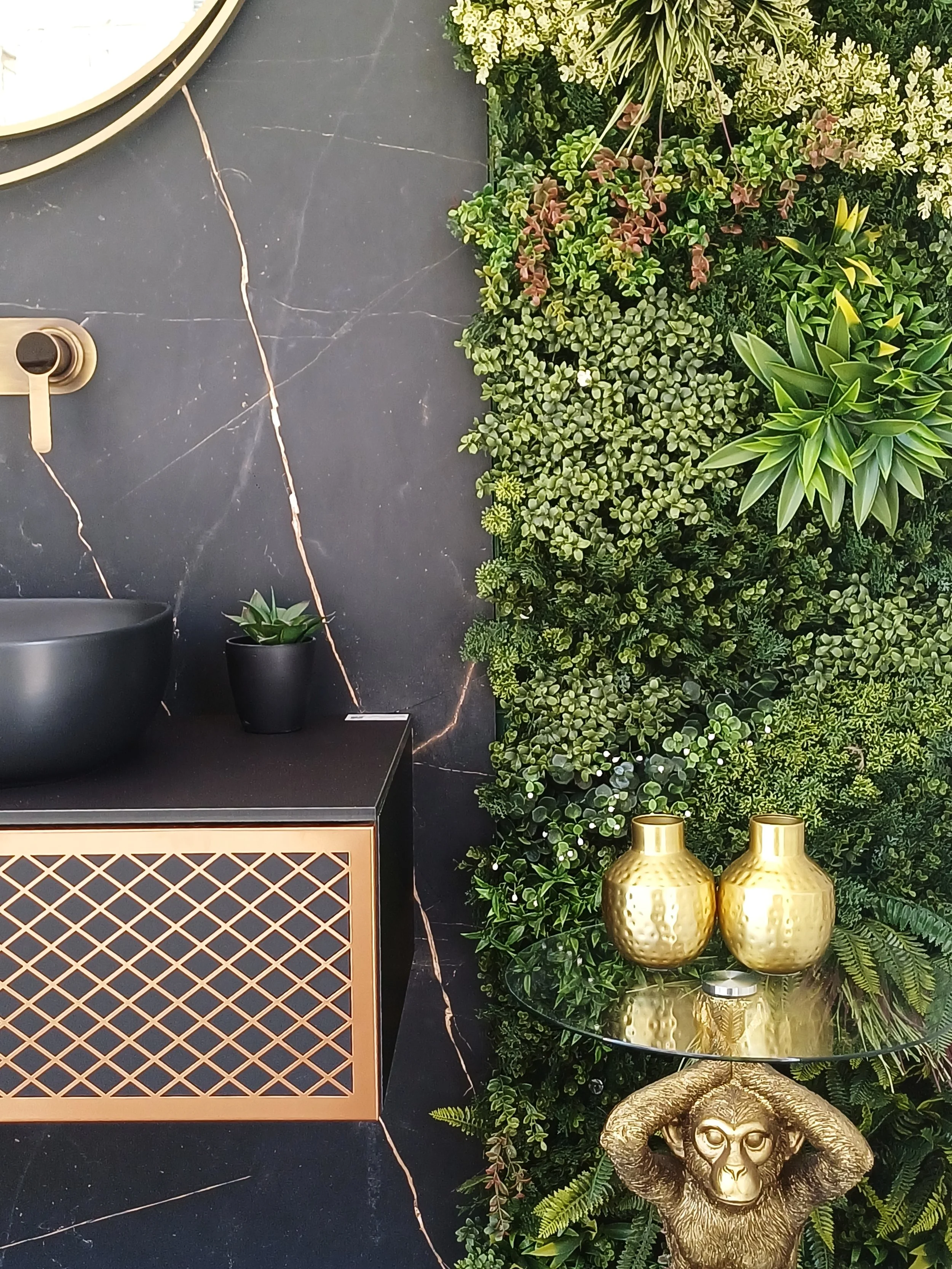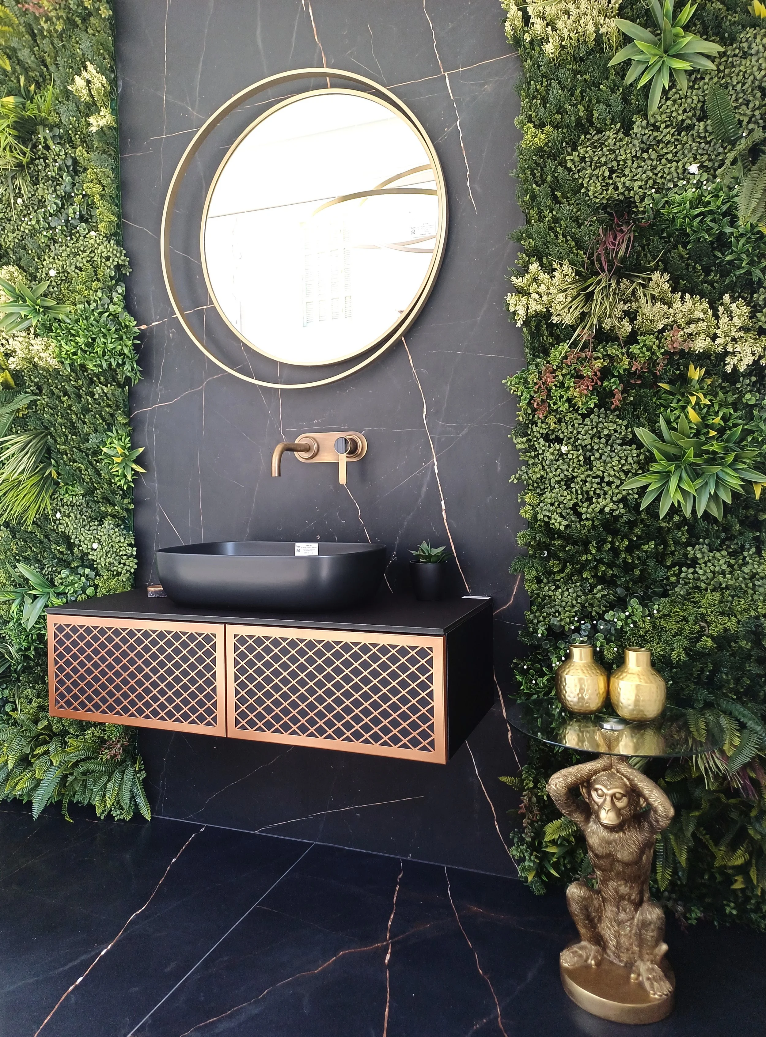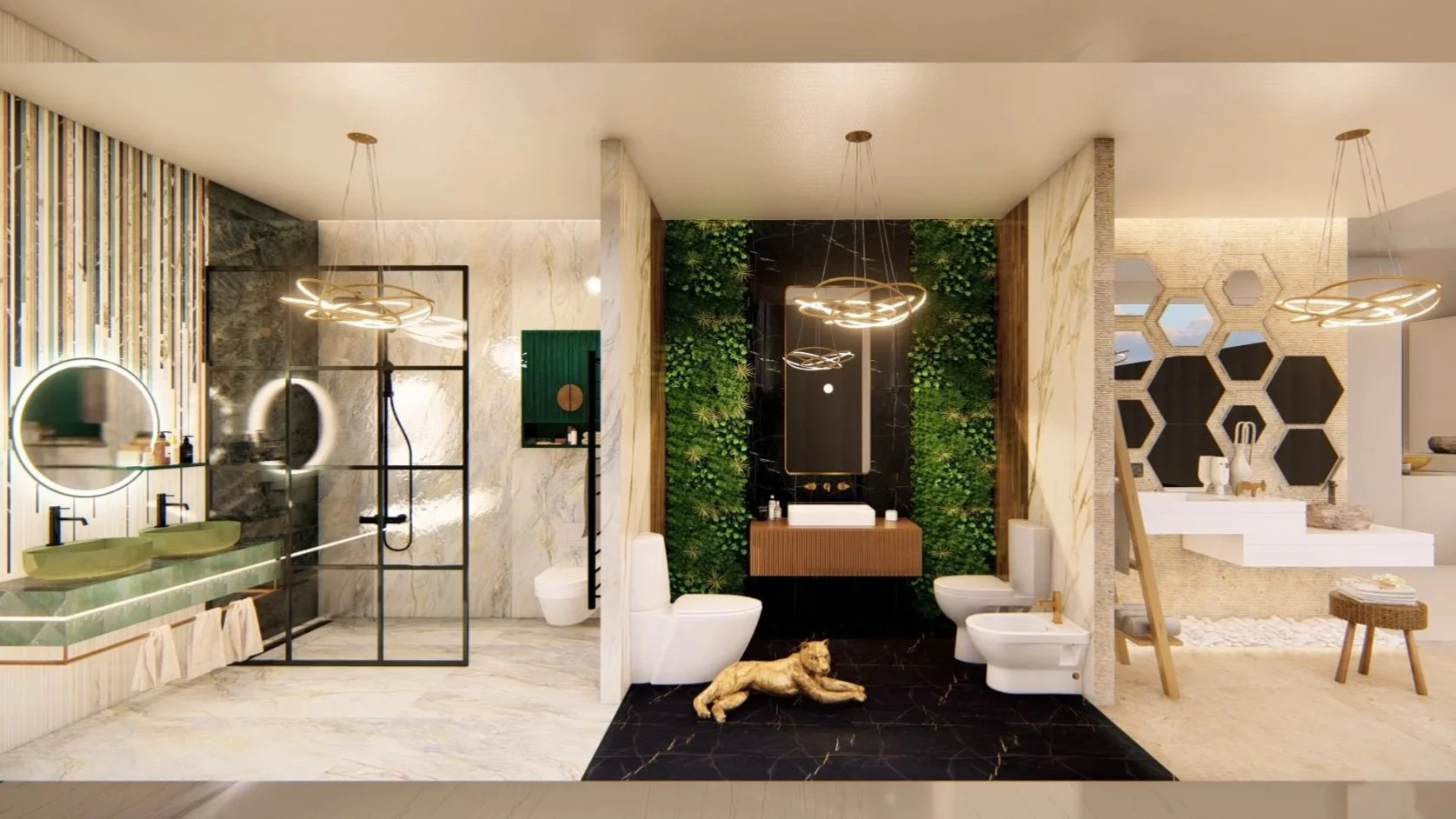 Each display area highlights a distinct mood — from modern elegance with marble and gold accents, to biophilic serenity with greenery and natural textures, and artistic vibrance through patterned tiles and expressive compositions. Thoughtful zoning, ambient lighting, and rich material contrasts create an immersive journey that promotes not just products, but complete living concepts.